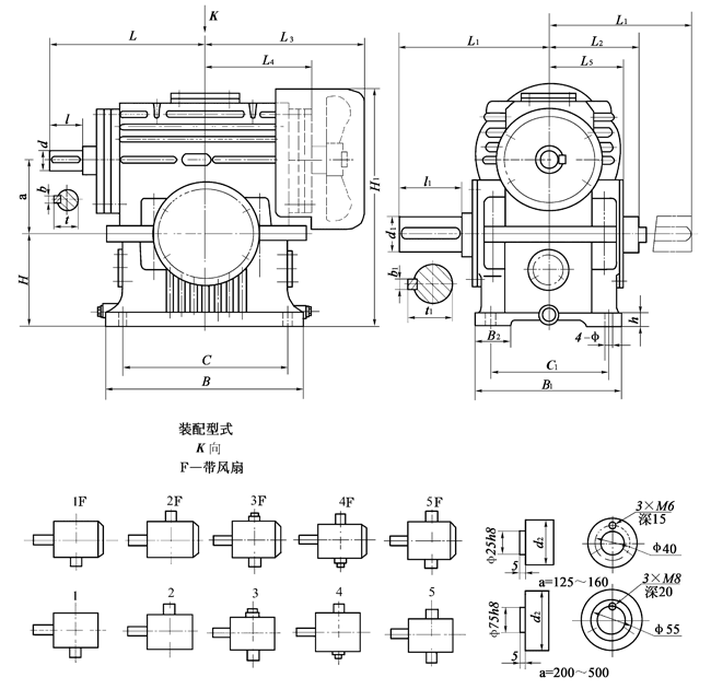 例 蝸桿在蝸輪之下, 中心距為200mm, 公稱傳動比為10, 第二種裝配型式, 有風扇冷卻的平面